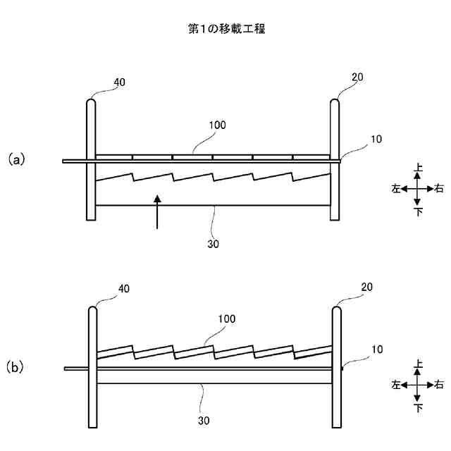 下流方向に向けて上方向に傾斜するジグザク状の断面形状を形成するn個の載置部に、停止された前記1番目からn番目の容器を移載する第1の移載工程と、
