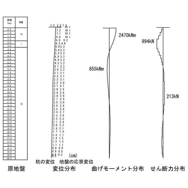 地盤改良後の地震時の地盤の変形による杭の応力解析の結果を示す図である。