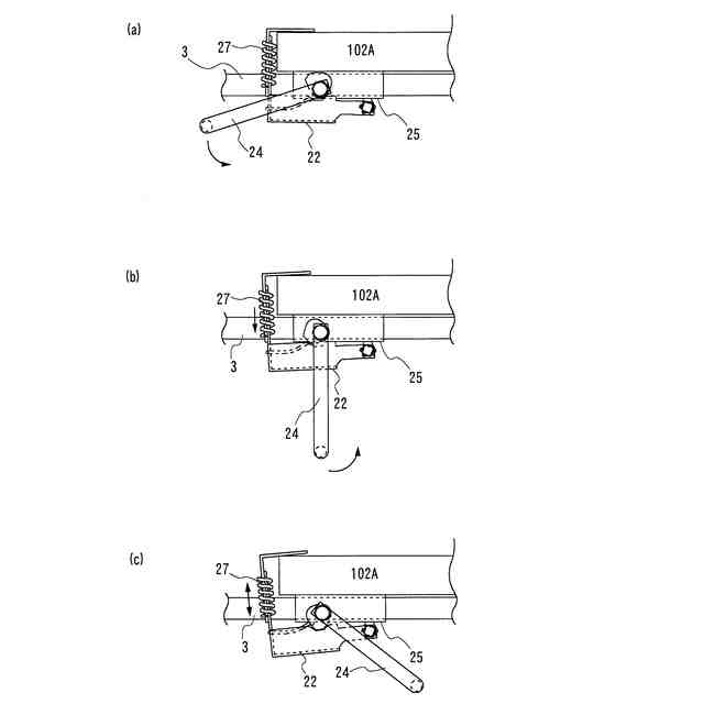 一方、テールゲートリフターには、例えば、図9に示すように、プラットフォーム300の後端側の縁付近に、載置面301から出入自在に設けられたストッパー310が備えられているものがある。このストッパー310は、弾性手段によってストッパー310の収納位置と突出位置とに位置付けられるものである(例えば、特許文献1及び2を参照。)。