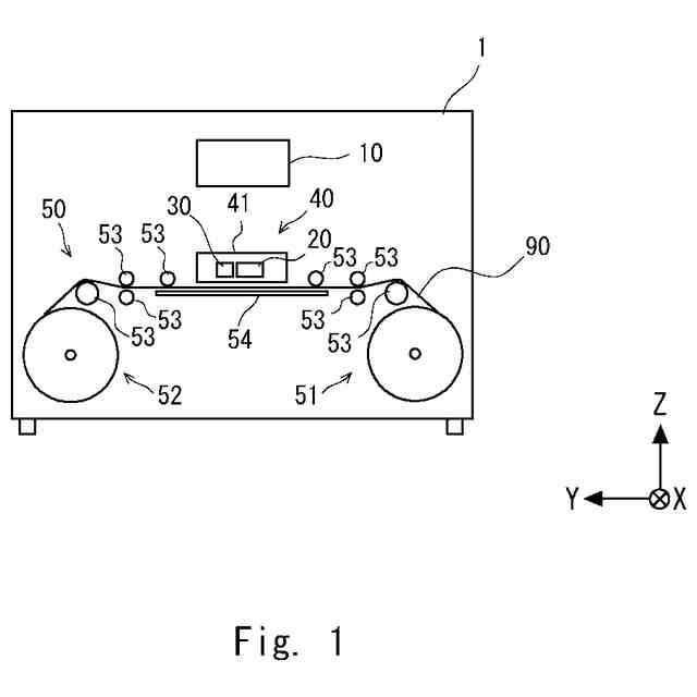 印刷装置1は、媒体90に画像を印刷するインクジェットプリンターである。図1に示した構成例では、印刷装置1は、ロール状に巻かれた状態でセットされる長尺状の媒体90に画像を印刷する。本実施の形態では、媒体90は、図の+Y方向に搬送される。このため、Y軸方向(特に、+Y方向)は搬送方向と称されてもよい。また、後述するように、本実施の形態では、X軸方向に走査可能な印刷ヘッドユニット20によって媒体90に画像が印刷される。このため、X軸方向は走査方向と称されてもよい。印刷装置1は、媒体90に印刷すべき画像の画像データから生成された印刷データに従って媒体90への印刷を実行する。