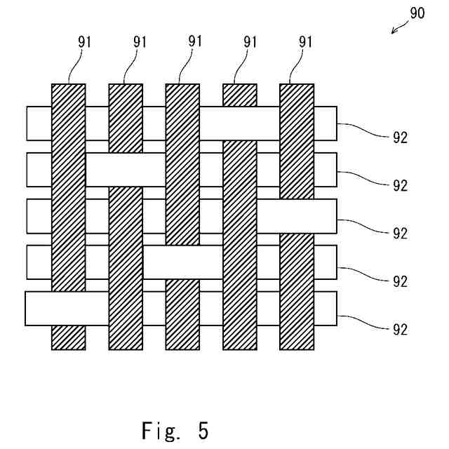 朱子織りの布帛の経糸と緯糸を示す模式図である。