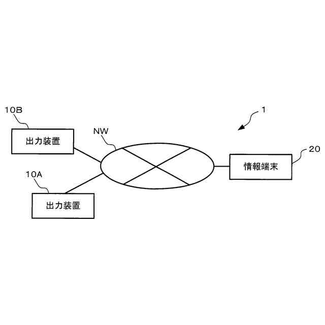図1は、本開示の一実施形態よる情報システム1の構成例を示す図である。図1に示されるように、情報システム1は、出力装置10A及び出力装置10Bと、情報端末20と、を含む。出力装置10と情報端末20とは、例えば有線又は無線のLAN(Local Area Network)等のネットワークNWに接続される。