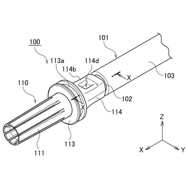 前記圧着部の前記前後方向での中間位置を通過する前記芯線の導体断面積に関して、(圧着後の前記導体断面積/圧着前の前記導体断面積)に100を乗じた値として表される圧縮率は、70%以下に設定され、