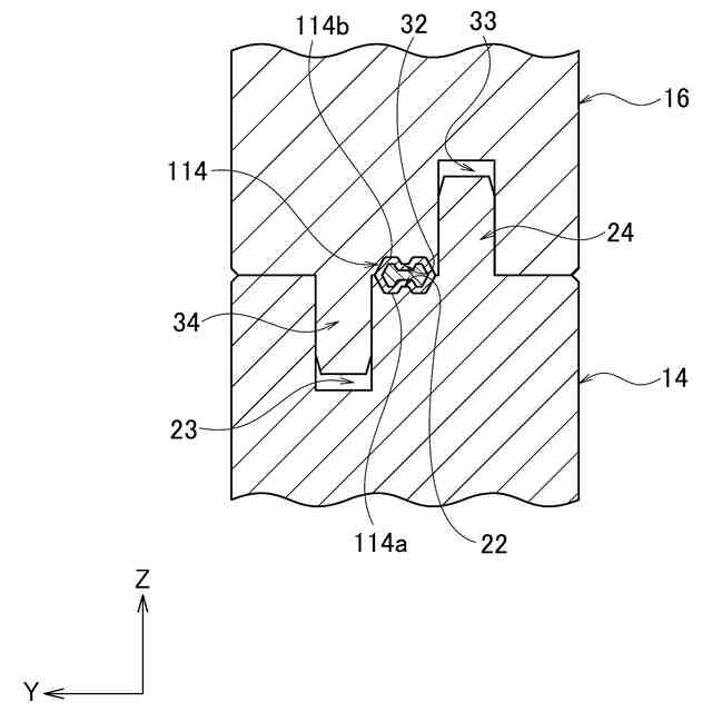 前記上型の一部の凸形状が転写された上方圧着凹部と、を有し、