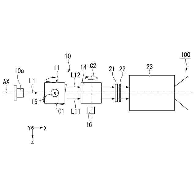 以下、図面において、必要に応じてXYZ直交座標系を用いて説明する。X軸は、光源装置10の照明光軸AXに平行な軸である。光源装置10の照明光軸AXは、光源部10aから射出される光L1の主光線に沿う軸で定義される。Y軸は、X軸に直交する軸であり、前段側光学素子11の第1回転軸C1に沿う軸である。Z軸は、X軸およびY軸に直交する軸である。