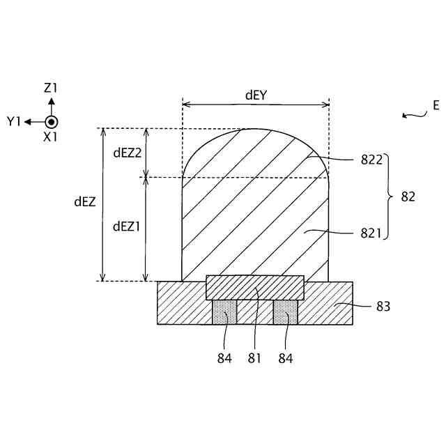 前記レンズ部は、円柱形状の基台部と、前記第2方向において前記基台部に接続し、半球形状の先端部と、を含み、