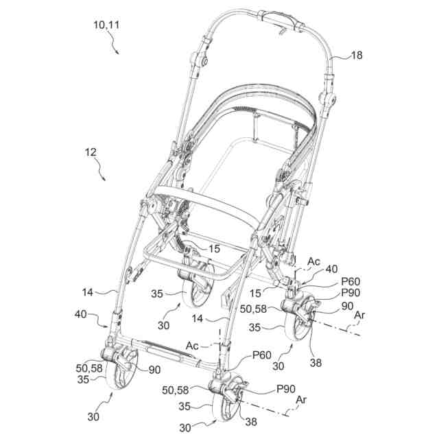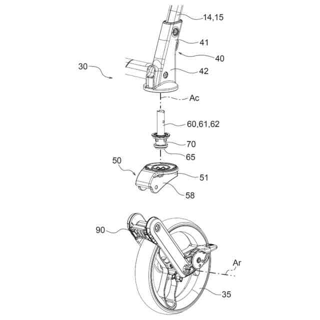 従来、乳母車や揺動椅子、ペットカート等の育児器具や手押しカートの脚には、キャスターが取り付けられている。キャスターは、回転軸線を中心として車輪が回転可能となるだけでなく、回転軸線に交差して延びるキャスター軸線を中心として車輪および車輪を保持する車軸が回転可能となるように、車輪を保持する保持機構として用いられる。手押しカート用のキャスターは、操作者から手押しカートに加えられる推進力の方向に応じて、キャスター軸線を中心として車輪および車軸を回転させる。これにより、操作者が意図した手押しカートの旋回を実現することができる。