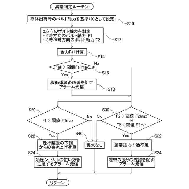 前記制御装置は、前記第1のボルト軸力が第1の所定閾値を超えると、前記走行装置が異常状態にあると判定し、建設機械の使い方に注意を促すための信号を前記警報装置に発信し、