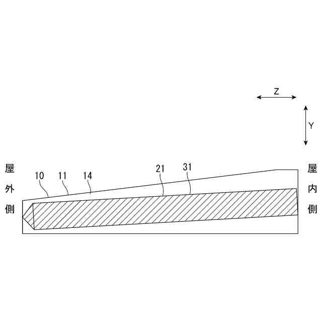 隙間塞ぎ体21は、Z軸方向に延びて配設されていると共に、屋内側から屋外側に向かうに連れて下方に傾斜する勾配が設定されている。