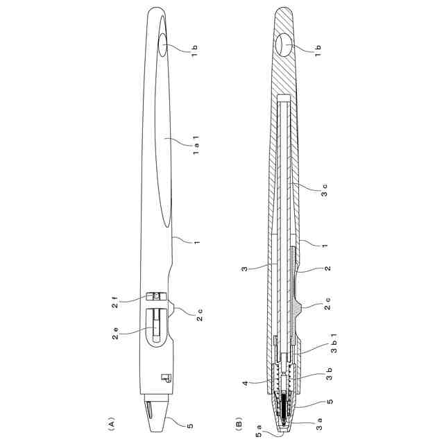 したがって、後者のサイドノック式筆記具は、ノック操作の際に軸筒の持ち替えが容易であるという利点があり、これによりサイドノック式筆記具は、工場の製造現場などにおいて用いる筆記具として、採用価値が高いと考えられる。