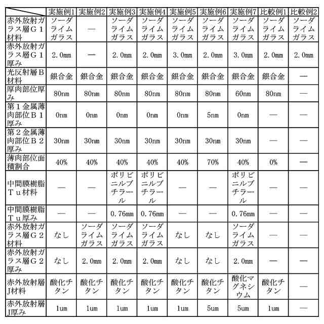 また、一定面積割合の厚肉部位を有しつつ、第2金属薄肉部位の積方向での厚みを50nm以下とすることで、ガラス積層体の全体での、面平均日射反射率が40%以上を確保しつつも、適切な採光性が得られることを確認している。