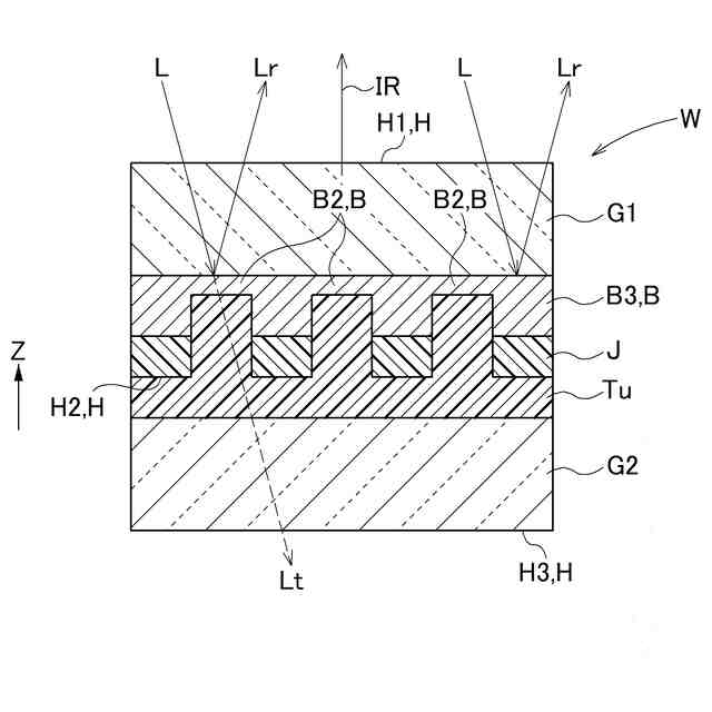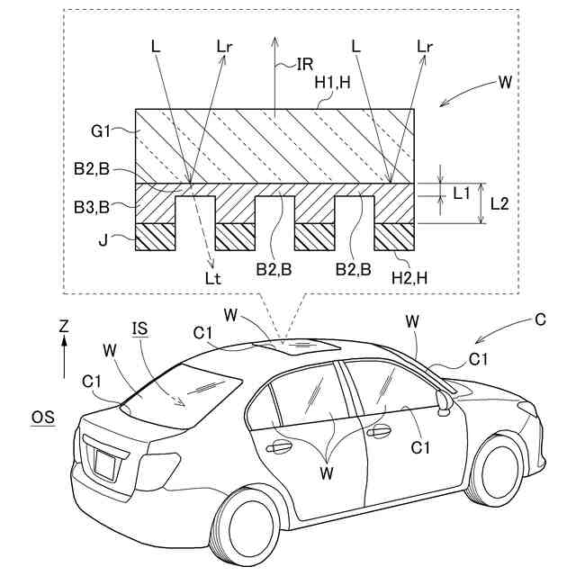上記特許文献1に示されるガラス複合体のように、銀等の金属材料から構成される遮蔽層を有する場合、例えば、ガラス複合体にて外部領域と内部領域とを区画される窓部を有する車両等の構造体においては、外部領域と内部領域との間での通信用の電磁波が遮られたり、外部領域から内部領域への採光性が悪くなったりすると共に、夜間にガラス複合体を介して内部領域から外部領域を見る際の映り込みが大きくなるといった課題があった。