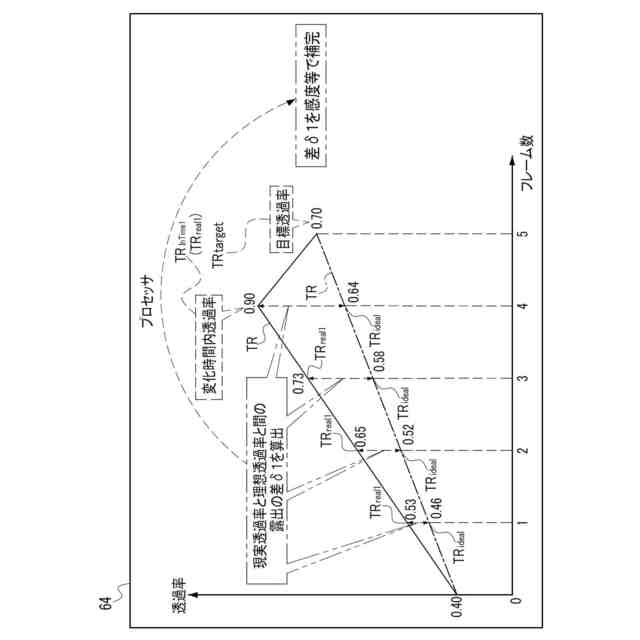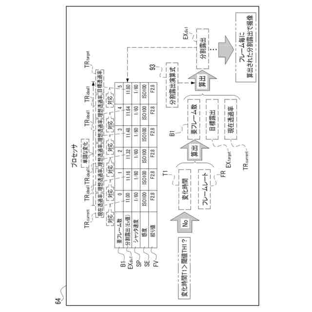 本開示に係る第3の態様は、変化時間と駆動時間とが第1閾値を超えた場合に第1制御が行われ、第1制御が、変化時間を駆動時間内にする制御であり、かつ、第1透過率から第2透過率へ現実的に変化する時間である現実変化時間と駆動時間とに基づいて定められた複数の第1分割露出を複数の分割露出として複数のフレームの露出に適用する制御である、第2の態様に係る制御装置である。