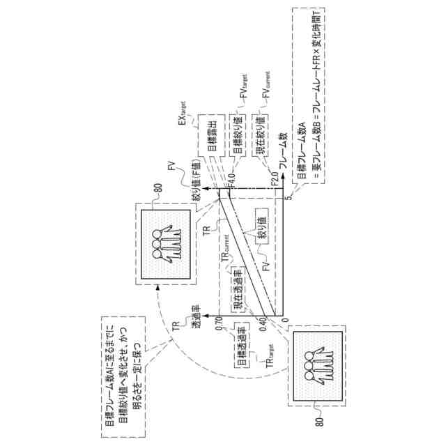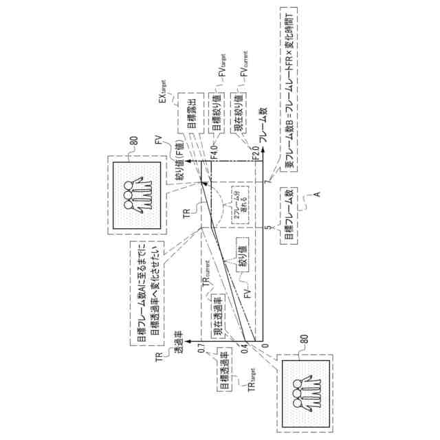 可動式の絞りを有する撮像装置に搭載された電子減光フィルタの透過率と前記絞りの駆動時間とに基づいて、前記撮像装置による撮像が行われることで得られる複数のフレームの露出を制御する