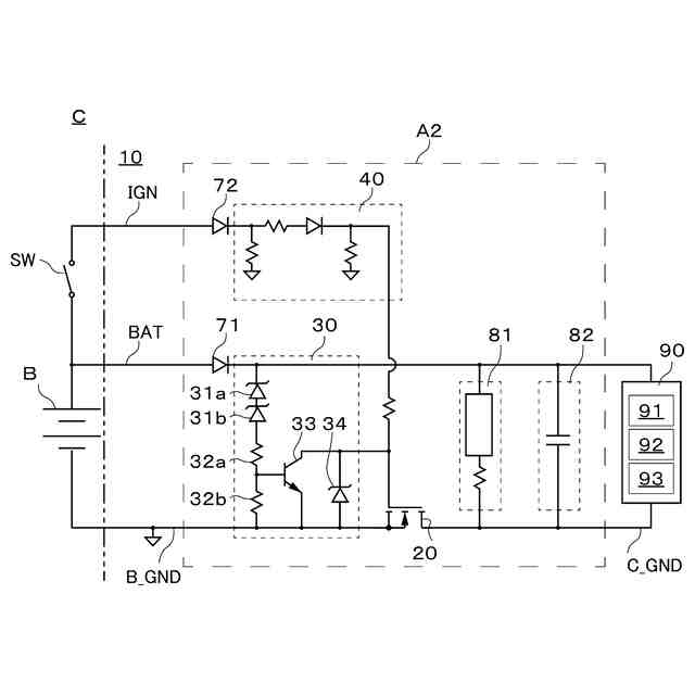 図1は、車両用表示装置1(図面内二点鎖線から右側)のサージ保護回路A1(粗破線内)の回路構成を示す図であり、車両Cのバッテリや発電機からなる電源Bからの電力を、車両用表示装置1内の負荷回路90へ供給するまでの構成について示している。負荷回路90は、車両情報を示す表示部93や、表示部93を制御する制御部92、レギュレーター91を備える。負荷回路90は、電源Bから供給される電力や、情報通信に伴って入力される電気信号に基づいて、所定の動作を行う。