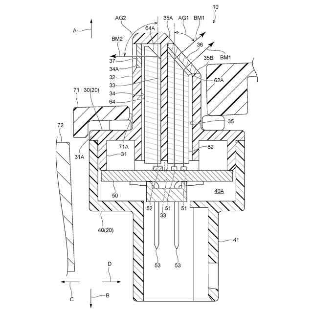 表示・照明装置10は、エネルギ受給部70のベース71に組付けられている。そして、表示・照明装置10の一部が、配置孔71Aから車幅方向外側へ露出されて、表示・照明装置10によって充電インレット72のコネクタ部72Aを照明するようになっている。以下、図1~図4を用いて、表示・照明装置10について説明する。なお、図2~図4に示される矢印A及び矢印B方向を、第1方向としており、第1方向は、車両の車幅方向に一致している。また、図1~4に示される矢印C及び矢印D方向を第2方向とし、矢印E及び矢印F方向を所定方向としての第3方向としている。さらに、以下の説明では、矢印A方向側を第1方向一方側とし、矢印C方向を第2方向一方側とし、矢印E方向を第3方向一方側としている。
