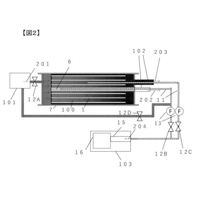 (8)1種類または2種類以上の気体で構成される気体を、気体分離膜モジュールへ供給及び封止する手段を有し、1種類または2種類以上の気体で構成される封止気体を、非透過気体および透過気体に分離する気体分離膜モジュールを有し、気体分離膜モジュールの封止気体を、非透過側を加圧及び透過側を減圧する、少なくとも一方の手段を有し、気体分離膜モジュールの封止気体を、非透過側および透過側の少なくとも一方から排出する手段を有し、気体分離膜モジュールの非透過気体及び透過気体の少なくとも一方について、気体の特性を測定する手段を有する、