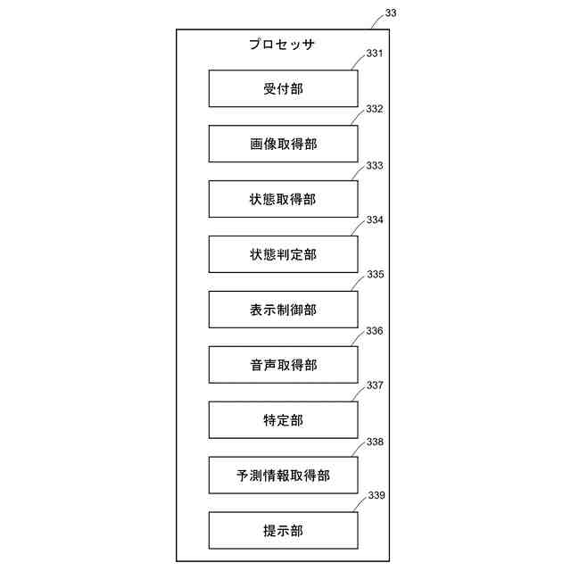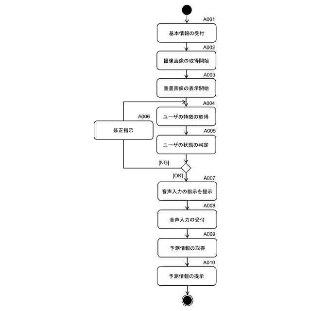 【解決手段】ユーザの顔を撮像している撮像画像を取得しA002、撮像中の撮像画像に、ユーザの顔を位置合わせするためのガイド部を重畳した重畳画像を継続的に表示させA003、撮像画像に基づいて、ユーザの状態が音声情報の取得に適切であるか判定しA005、ユーザの状態が適切化されていると判定された場合、ユーザから発せられた音声情報を取得しA008、ユーザの状態が適切化されていないと判定された場合、ユーザの状態の修正を促すための指示をユーザに提示A006するとともに、状態判定ステップが再度実行され、音声情報の取得が完了するまで重畳画像が継続的に表示され、且つ、状態判定が継続的に実行され、取得した情報をもとに認知機能の予測A009を可能とする。