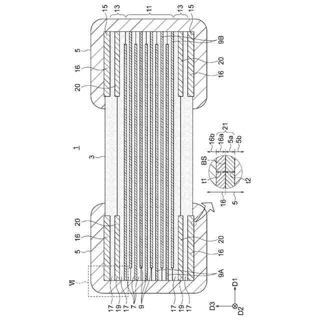 図1は、第1実施形態に係るコンデンサ1(積層型電子部品の一例)を示す斜視図である。図1及び後述する他の図には、便宜上、直交座標系D1D2D3が付されている。コンデンサ1は、いずれが上方又は下方とされて用いられてもよい。ただし、実施形態の説明では、便宜上、+D3側を上方として、上面及び下面等の語を用いることがある。
