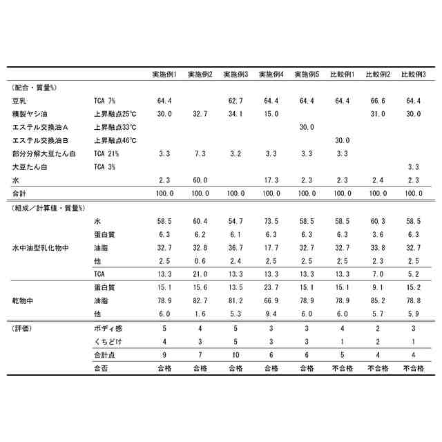 特許文献5は、豆乳と油脂を組み合わせた、水分20~50質量%、油分15~45質量%、澱粉15~40質量%を含む水中油型の乳化物を凍結乾燥するチーズ様スナック食品に関する技術である。また、特許文献6は、高乳化性の蛋白素材を用いて、水相より多量の油相を有するO/W乳化物を低温フライした、固型食品中50質量%以上の大量の油脂を含んだ、滑らかな舌触りを有した食品に関する技術である。特許文献7は、油分が30%以上、水分が20%以下、糖質と蛋白加水分解物を含んだ高油分低水分乳化食品に関する技術である。