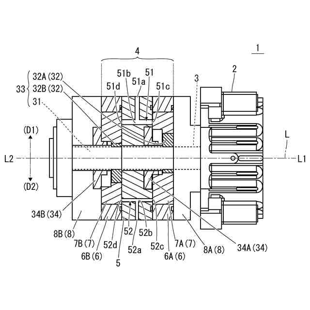 モータの回転出力軸と連結し第1方向側から第1方向側とは反対方向側の第2方向側へと一直線上に延びるシャフト、およびシャフトに対し偏芯位置で一体的に結合した一対の偏芯部材からなる回転可能な偏芯カムシャフトを有する軸部と、
