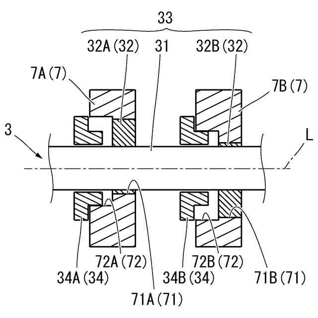 前記軸部は、各前記ロータと対応する位置に前記偏芯回転シャフトと連動して回転しない一対の外歯部材を有するとともに、前記偏芯部材および前記外歯部材が円形外郭形状で形成されており、