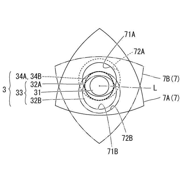 各前記ロータは、ルーローの三角形の外郭形状を有するとともに、中央に、前記軸部の前記偏芯部材が嵌まり込む内径寸法の円形内壁面、および、前記軸部の前記外歯部材と部分的に噛み合うよう、前記円形内壁面と同軸で前記軸部の前記外歯部材のピッチ円直径寸法より大きなピッチ円直径寸法で形成された内歯内壁面を有し、