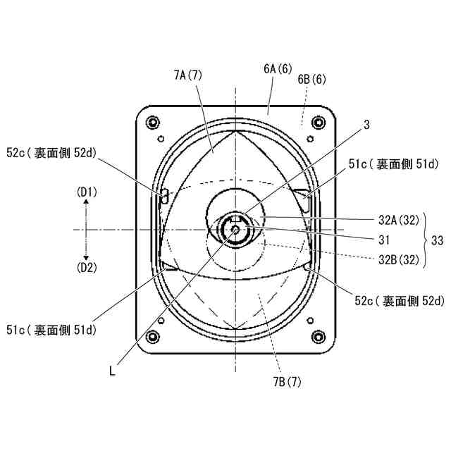 軸部を挿通させて端面が第1方向側および第2方向側を向くように配置され、側面と両端面それぞれとを連通する吸気路および排気路が形成されている吸気排気部と、