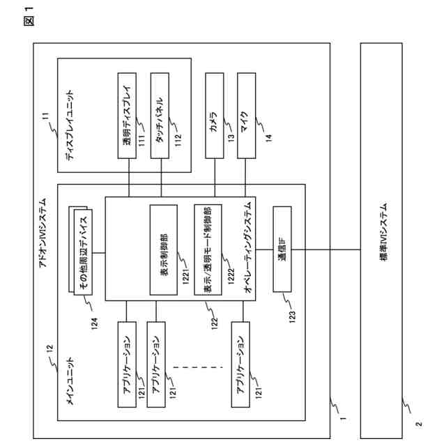 自動車に搭載されている標準のIVI(In-Vehicle Infotainment)システムが交換不可である場合などに、IVI機能の追加や充実化のために、透明ディスプレイを備えた新たなIVIシステムを、標準のIVIシステムのディスプレイを覆う位置に透明ディスプレイを配置した形態で追加装備(アドオン)し、ユーザの選択に応じて透明ディスプレイの表示/透明状態を切り替えることにより、標準のIVIシステムの機能を維持したまま、新たなIVIシステムの追加に際してのスペース上の課題や、新たなIVIシステムの透明ディスプレイの視認性の課題をクリアすることが考えられる。