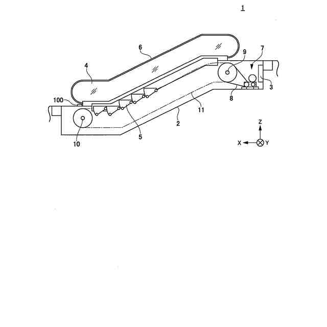第1実施形態にかかる乗客コンベアの構成例を示す概略構成図である。