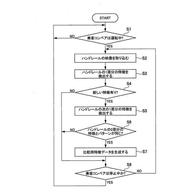 機械学習部が、前記手すり表面検出部の検出結果を学習して前記移動手すりの特徴部の情報を含む比較用特徴データを生成し、