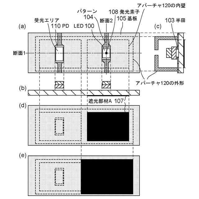 図2に基板105の断面図を示す。図2(a)は基板105の上面より見た図である。図2(b)、(c)はそれぞれ断面1、断面2の点線で切断した際の断面を示している。また図2(d)は、LED100実装面とは反対側の基板面(裏面)より見た図である。図中の数字は、基板105表面に形成される厚み35umの銅箔パターン104(以降、パターン)、LED100のランドとパターン104を接合する半田103、本実施例の迷光対策として基板105の裏面に形成される厚み35umの遮光部材(光吸収材)A107である黒シルクである。上記のパターン104及び遮光部材A107の厚みは基板製造上の寸法の具体例を示したものであり、製造条件を変えても良いため本構成に限定されるものでは無い。また、遮光部材A107のシルク色はLED100の発光波長の光の反射率が低い(光を吸収する)色であれば良いため、本構成に限定されるものでは無い。