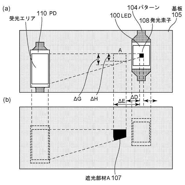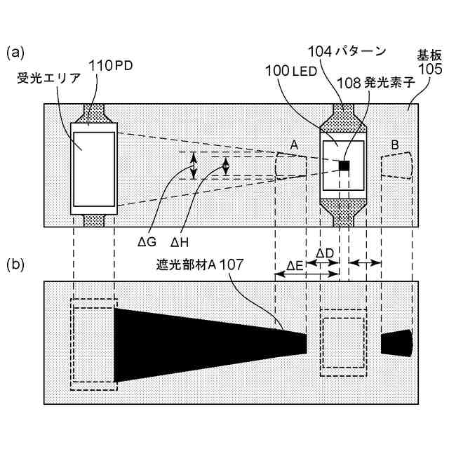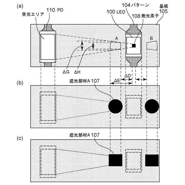 しかしながら、特許文献1や特許文献2記載の方法では、発光手段と黒レジストや遮光塗料(以降、黒レジストと遮光塗料を合わせて遮光部材と呼ぶ)間に隙間ができる。これは製造上の実装性(実装部に製造公差で被らないようにする)を確保するために、遮光部材と発光手段を離す必要があるためである。その隙間より光が透過し十分な迷光対策とならないおそれがあり、課題となっていた。また、特許文献3では実装ランドの拡大により、実装時に熱が逃げやすくなることによる実装不良の懸念があり、課題となっていた。従って、本発明の目的は、部品の実装性を確保しつつ、迷光を抑制する光学センサを提供することにある。