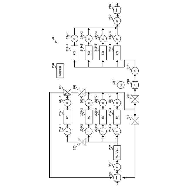 【解決手段】互いに並列に配置された水処理装置205-1~205-4と、水処理装置水処理装置205-1~205-4それぞれに被処理水をそれぞれ供給するポンプ204-1~204-4と、水処理装置205-1~205-4それぞれから流出される処理水の流量が、水処理装置205-1~205-4から供給先へ供給される処理水の量に応じた必要流量となるように、ポンプ204-1~204-4と水処理装置205-1~205-4の運転とを制御する制御装置220とを有する。