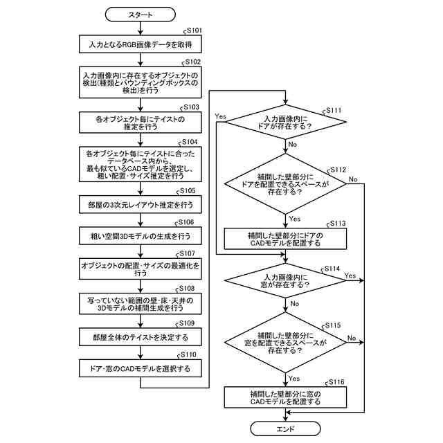 近年、部屋の内部などの空間を撮影した写真の画像からAI(Artificial Intelligence)技術を駆使して、部屋の内部の空間の三次元モデルを生成する手法の研究が活発化している。これらの中には、普通のカメラ写真一枚を用いて写っている範囲の部屋の内部の空間の三次元モデルを生成するものや、カメラ写真を複数枚用いるもの、360度パノラマ写真一枚から部屋の内部の空間全体の三次元モデルを生成するものなどの様々な手法が存在する。