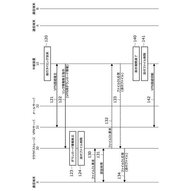 また、本発明にかかる上記中継装置の一構成例は、前記移行処理部が、前記第2の添付ファイルへのリンク情報として、前記通信網上に設けたVPN接続を経由したリンク情報を用いるように構成されている。