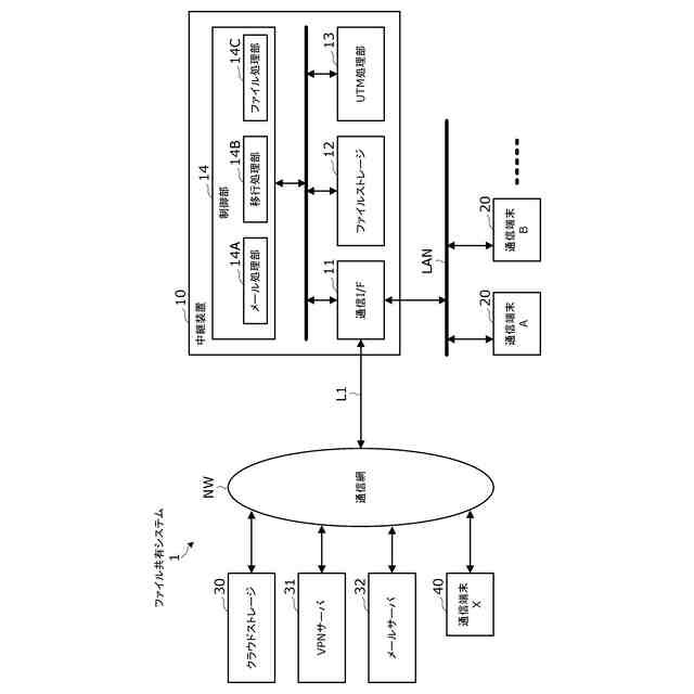 このような目的を達成するために、本発明にかかる中継装置は、通信網と接続されて、LANを介して配下に接続された通信端末を前記通信網に中継接続するように構成された中継装置であって、ファイルを保存するように構成されたファイルストレージと、前記通信端末から前記通信網上のメールサーバへ送信されたメール送信要求を取り込んで、前記メール送信要求に含まれる元のメールから添付ファイルを分離するように構成された制御部とを備え、前記制御部は、前記元のメールから分離した前記添付ファイルからなる第1の添付ファイルを前記通信網上のクラウドストレージに保存するとともに、前記添付ファイルからなる第2の添付ファイルを前記ファイルストレージに保存し、前記添付ファイルを分離した分離後メールのメール送信要求を前記メールサーバに送信するように構成されたメール処理部と、前記クラウドストレージが決定した前記第1の添付ファイルの保存期間に基づいて、前記保存期間の途中に移行タイミングを設定し、前記移行タイミングが到来した場合、前記クラウドストレージで使用される前記添付ファイルのリンク情報を修正することにより、ダウンロード要求に応じて前記クラウドストレージが提供する前記添付ファイルのリンク先を、前記クラウドストレージに保存されている前記第1の添付ファイルから、前記ファイルストレージに保存されている前記第2の添付ファイルへ移行させるように構成された移行処理部とを備えている。