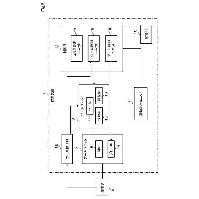 これによれば、作業者に危険源が接触する可能性が生じた場合であっても、ツール制限制御が実行されることによりツールの出力を制限したり瞬時停止したりすることが可能となり、また、ブレーキ制御が実行されることによりアームユニットの関節の動きを抑制することが可能となり、その結果、作業者の安全性が確保される。このように、上記構成によれば、ツール制限制御およびブレーキ制御により作業者の安全性が確保されるようになっていることから、ブレーキとして、アームを瞬時に停止できるような能力のものは必要ではない。したがって、上記構成によれば、ツールの操作性を向上させるとともに安全性を高めることができる。