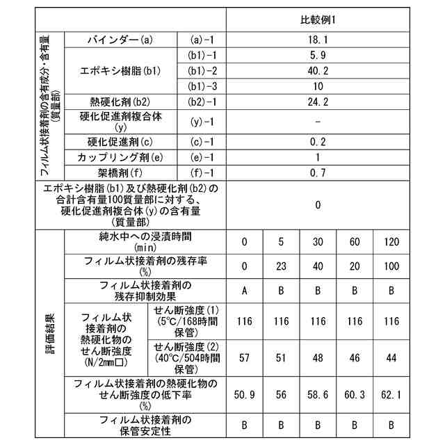 フィルム状接着剤付き半導体チップのピックアップ時には、フィルム状接着剤が支持シート又はダイシングシートから適切に剥離しないと、正常にピックアップできない。典型的な異常としては、ピックアップ時に、フィルム状接着剤付き半導体チップ中の一部のフィルム状接着剤が、支持シート又はダイシングシート上に残ってしまうものが挙げられる。さらに、熱硬化性のフィルム状接着剤は、その製造後から使用時までの間に、加熱しなくても経時によって徐々に硬化が進行することがある。このように保管安定性が低くて目的外の硬化が進行し、物性が変化してしまうと、フィルム状接着剤はその性能を十分に発揮できない。これに対して、特許文献1で開示されているフィルム状接着剤は、これらの異常の抑制を目的としていない。