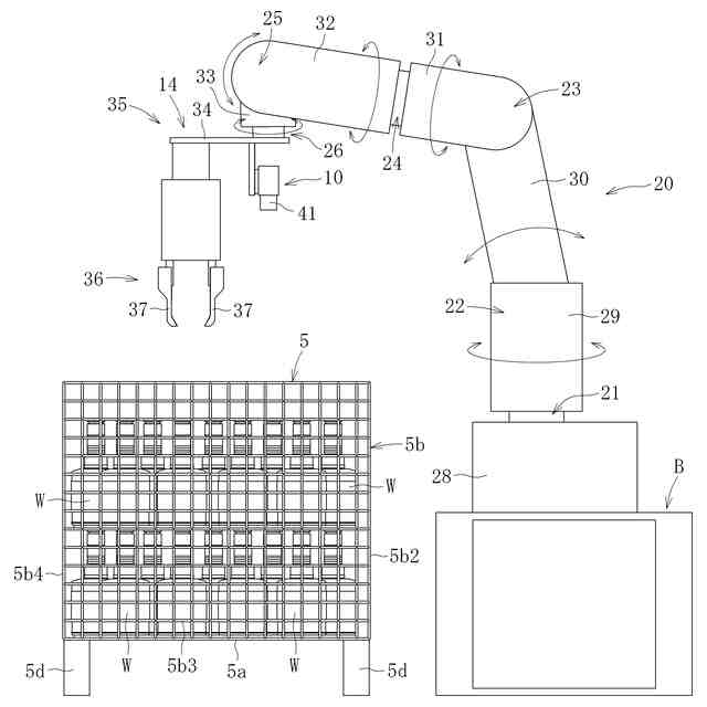 しかしながら、ワークを収納しているパレットのワーク載置面(底面)に歪や傾斜がある場合、さらには、ワークへの傷付き防止のためにクッション材を敷設しているものであって、クッション材に撓みが生じている場合等においては、ワークが鉛直軸に対して傾斜することになる。このような場合には、ワークをロボットハンドで把持できなかったり、把持できても安定して把持できていなかったりするおそれがあった。
