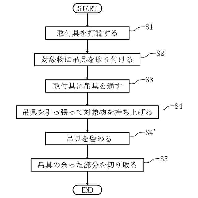 【解決手段】構造物に対し取付具を打設する第一の工程(ステップS1)と、対象物(ダクト)に索状の吊具を取り付ける第二の工程(ステップS2)と、取付具に索状の吊具を通す第三の工程(ステップS3)と、索状の吊具を引っ張って対象物を持ち上げる第四の工程(ステップS4)とを実行する。第四の工程の後、対象物を持ち上げた状態で、索状の吊具の自由端部から離れた位置において索状の吊具の動きが制限されることにより、対象物が吊り下げられる。
