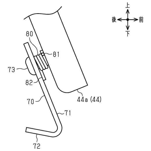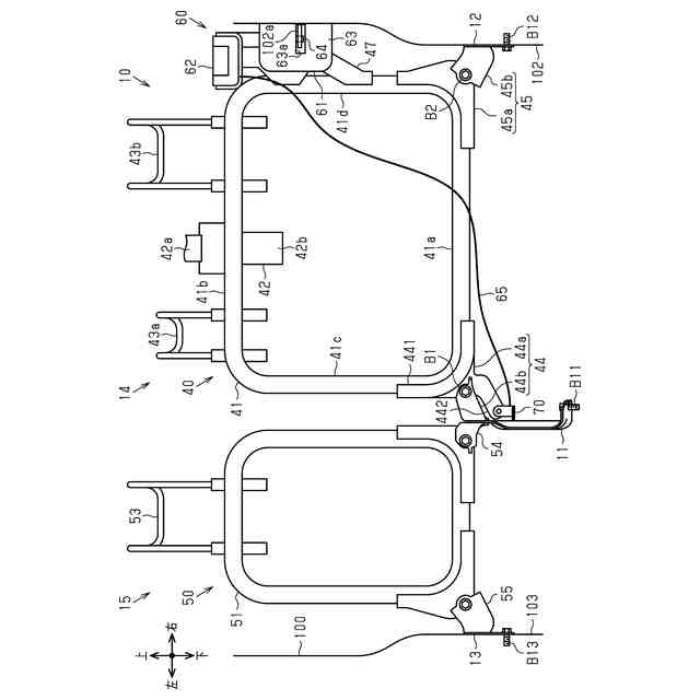 ブラケットは、第1サイドフレームの下部に固定されている。ブラケットは、車幅方向に延びる回動軸を中心として支持ベースに対して回動可能に取り付けられている。