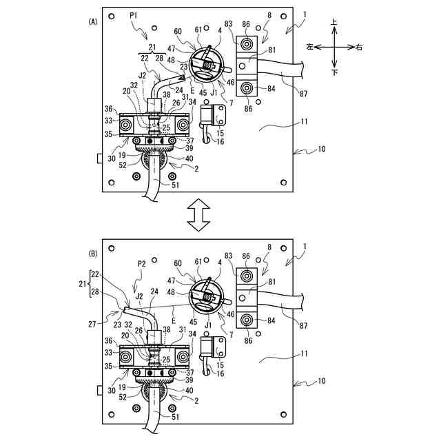 本発明の請求項4に係る糸巻回装置の前記制御装置は、前記糸の切断に際して、前記ノズル回動部を駆動し、前記ノズルを前記対向位置から前記離隔位置に回動させ、前記ノズルを前記離隔位置に回動後、前記ボビン回転部を駆動し、前記ボビンを前記巻回方向へ回転させて、前記離隔位置に配置された前記中空部の前記刃部により、前記糸を切断する。糸巻回装置の制御装置は、ノズルを離隔位置に回動後、ボビン回転部を駆動し、ボビンを巻回方向へ回転させることで、糸を引っ張り、中空部の先端部に形成された刃部で糸を切断しやすくすることに貢献する。