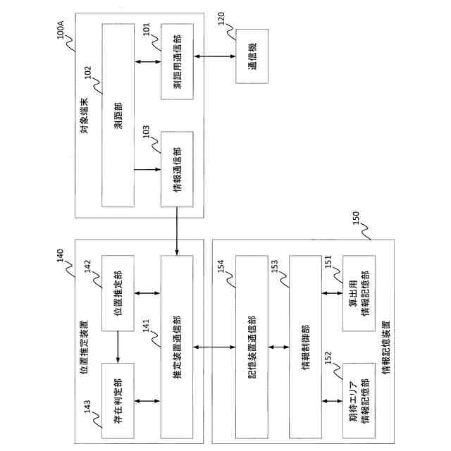 実施の形態1に係る対象端末、位置推定装置及び情報記憶装置の構成を概略的に示すブロック図である。