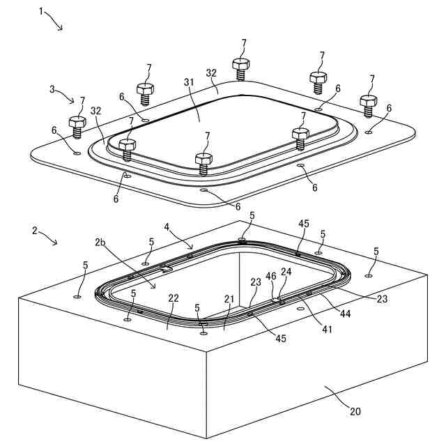 【解決手段】第1部材2は、平坦面状で且つ環状の第1面22と、前記第1面の内周側に設けられた内周壁部23と、を備え、第2部材3は、平坦面状で且つ環状の第2面33を備え、前記第1部材及び前記第2部材のうちの一方は、環状のガスケット4の配置位置の外周側に設けられた外周壁部を備えており、前記ガスケットは、前記第1面と前記第2面との間に圧縮状態で挟持され前記第1面と前記第2面との間をシールする環状のシール本体部41と、前記シール本体部の幅方向両側に設けられ前記第1面及び前記第2面のうちの少なくとも一方面に弾接して前記シール本体部が自立するように支持するフランジ部44と、を備え、前記シール本体部及び前記フランジ部は、前記内周壁部及び前記外周壁部に非接触の状態で前記第1面と前記第2面との間に介在する。