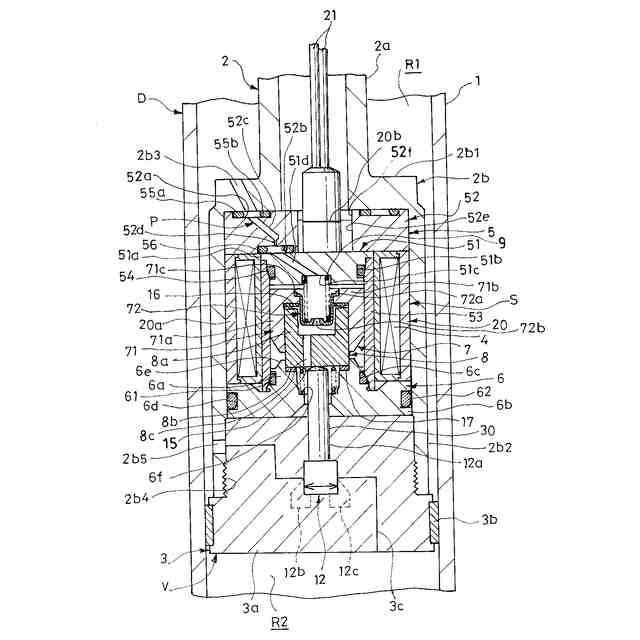 より詳細には、ソレノイドは有頂筒状のピストンの内部の上方に配置されており、バルブ部分がソレノイドの下方に配置されている。また、ソレノイドは、筒状のコイルと、コイルの上方側に配置される第1固定鉄心と、コイルの下方側に配置される第2固定鉄心と、コイル内であって第1固定鉄心と第2固定鉄心との間に配置される第1可動鉄心および第2可動鉄心と、第1固定鉄心と第1可動鉄心との間に介装されて第1可動鉄心を第2可動鉄心側へ向けて付勢するコイルばねとを備えており、第1固定鉄心を上方にしてピストン内に収容されている。