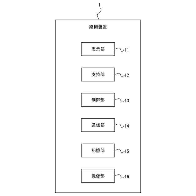 図1に示されるように、路側装置1は、道路3の路側に設置され、道路3を走行する車両2の運転手に対して注意喚起等各種の情報(以下、報知情報という)を呈示するための装置である。路側装置1は、車両2の運転手が視認可能なサイズ及び輝度で報知情報を表示する表示部11と、表示部11を支持する支持部12とを備える。道路3を走行する車両2は、道路3を走行中であってもよいし、停車していてもよい。車両2は、車高の比較的高い大型車両、例えばトラック等であるが、これに限られない。車両2は、任意の車両であってもよく、例えば、自動車、自動二輪車、原動機付自転車、軽車両を含む。路側装置1は、例えば、表示部11に、「前方注意」、「走行速度に注意」等の報知情報を表示する。ただし、報知情報はこれに限定されず、任意の内容とすることが可能である。図1では、路側装置1が、車両2が走行する道路3の傍の路面上に設置される例を示すが、これに限定されない。路側装置1は、例えば、道路3の上部に渡された橋又は門型の柱に設置する等の、道路3の近くの任意の場所に設置されてもよい。