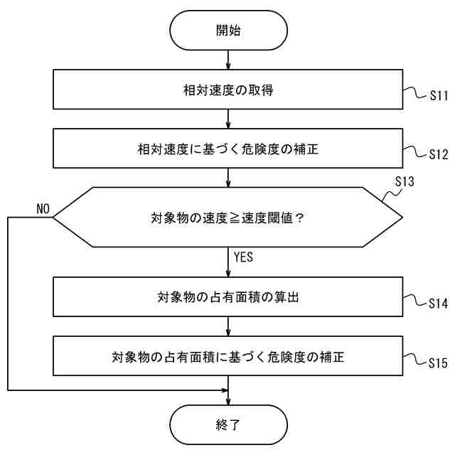 特許文献1に記載されている方法において、危険領域は車載カメラの画像中に存在する遮蔽物の領域の一部を含む。しかし、画像中の遮蔽物の存在を危険領域とみなしても、遮蔽物に隠されている死角範囲に起因する危険の可能性を表す度合い、すなわち危険度の決定精度を高めることが難しい。