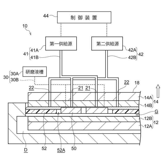 前記第一供給系によって前記第一剥離流体を前記上定盤と前記円盤状基板との間に供給する処理と、前記第二供給系によって前記第二剥離流体を前記上定盤と前記キャリアとの間に供給する処理と、を実行する制御装置、