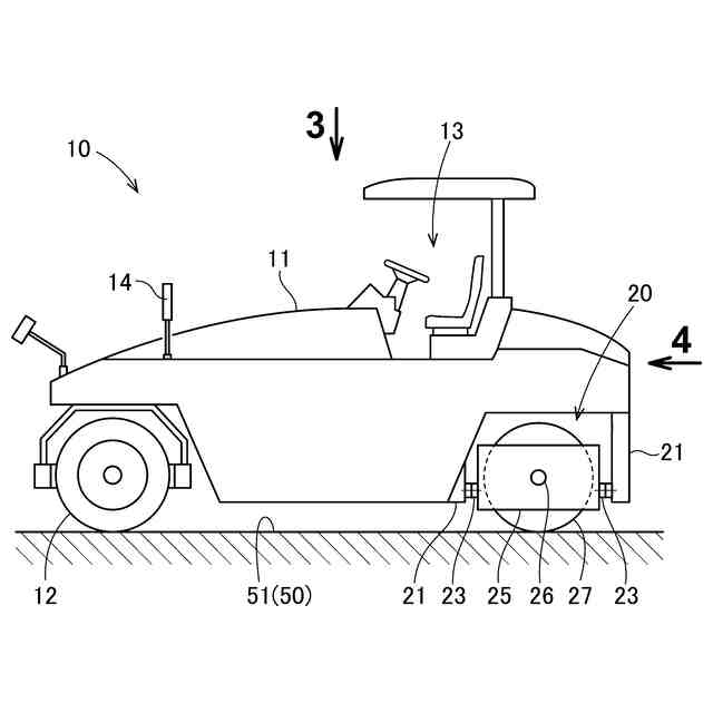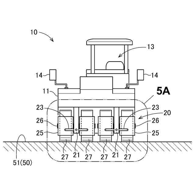 しかし、シリンダ106の昇降の調整は手動で行われているため、斜面用ローラ100を前進させながら測点の位置により形状が変化する湾曲面に合わせて、ローラ車輪102の角度を一致させることは難しい。また、2本の後輪軸104にそれぞれ2個ずつローラ車輪102が設けられているため、角度変更はローラ車輪102を2個分単位でしか変更できず、湾曲面の半径が小さい場合はローラ車輪102とバンク51との間に隙間109が生じ、そのまま転圧すると路面にいわゆるローラマークができてしまう。